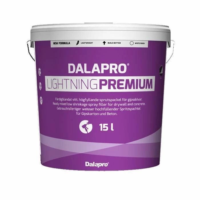 Dalapro Lightning Premium is a white, ready-mixed spray filler. The product has a unique formula that gives it a high filling capability. The special consistency makes the product easy to work with.
